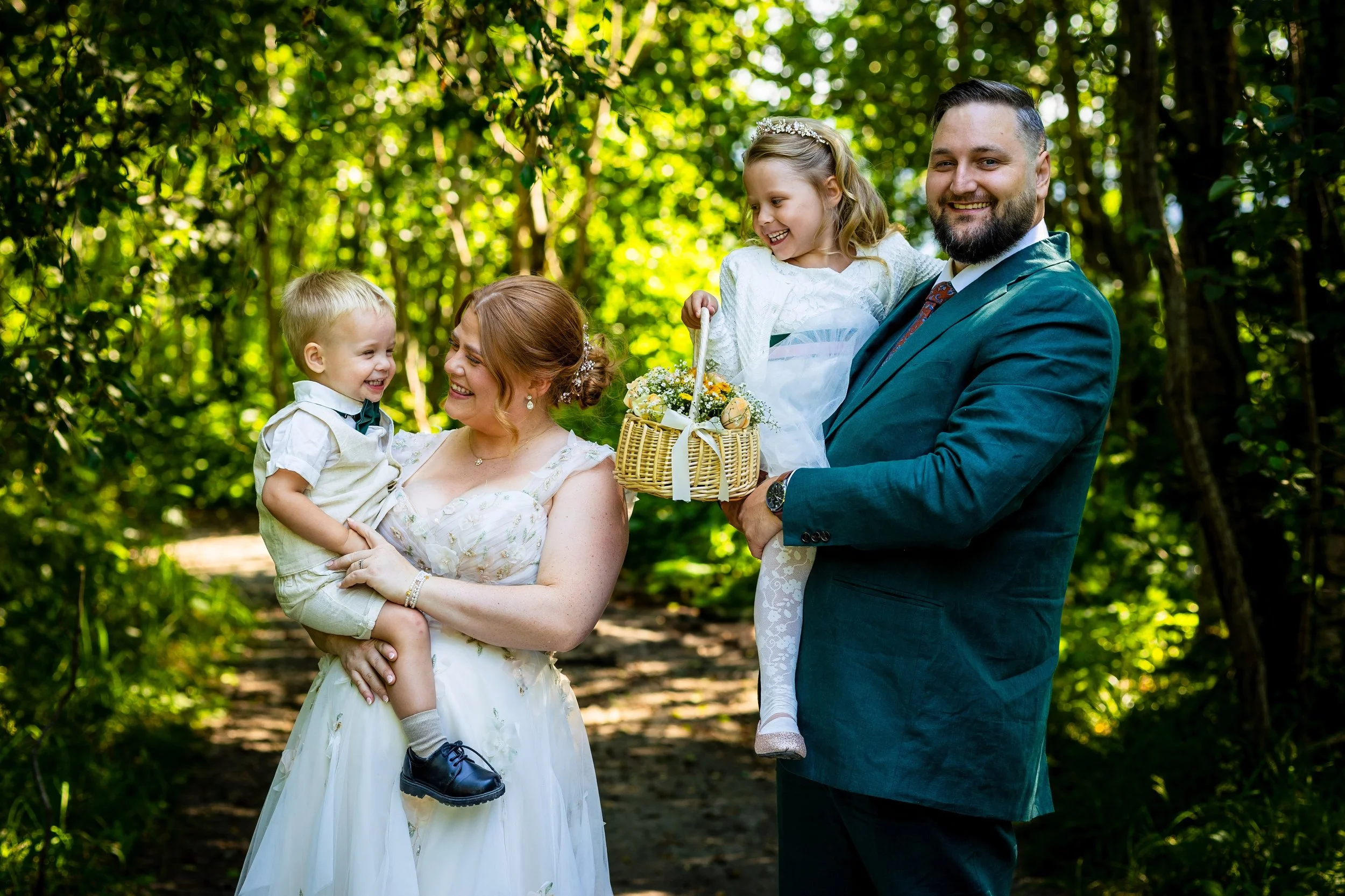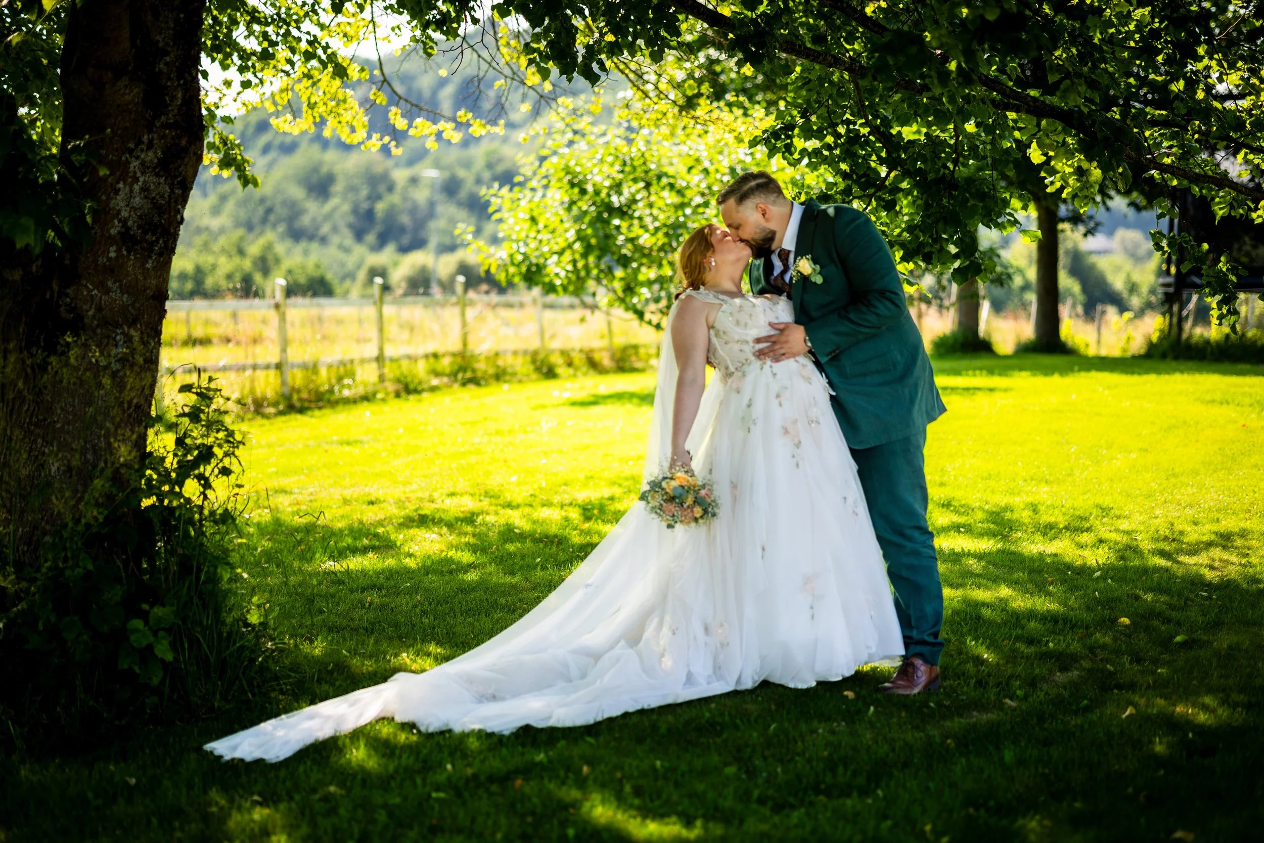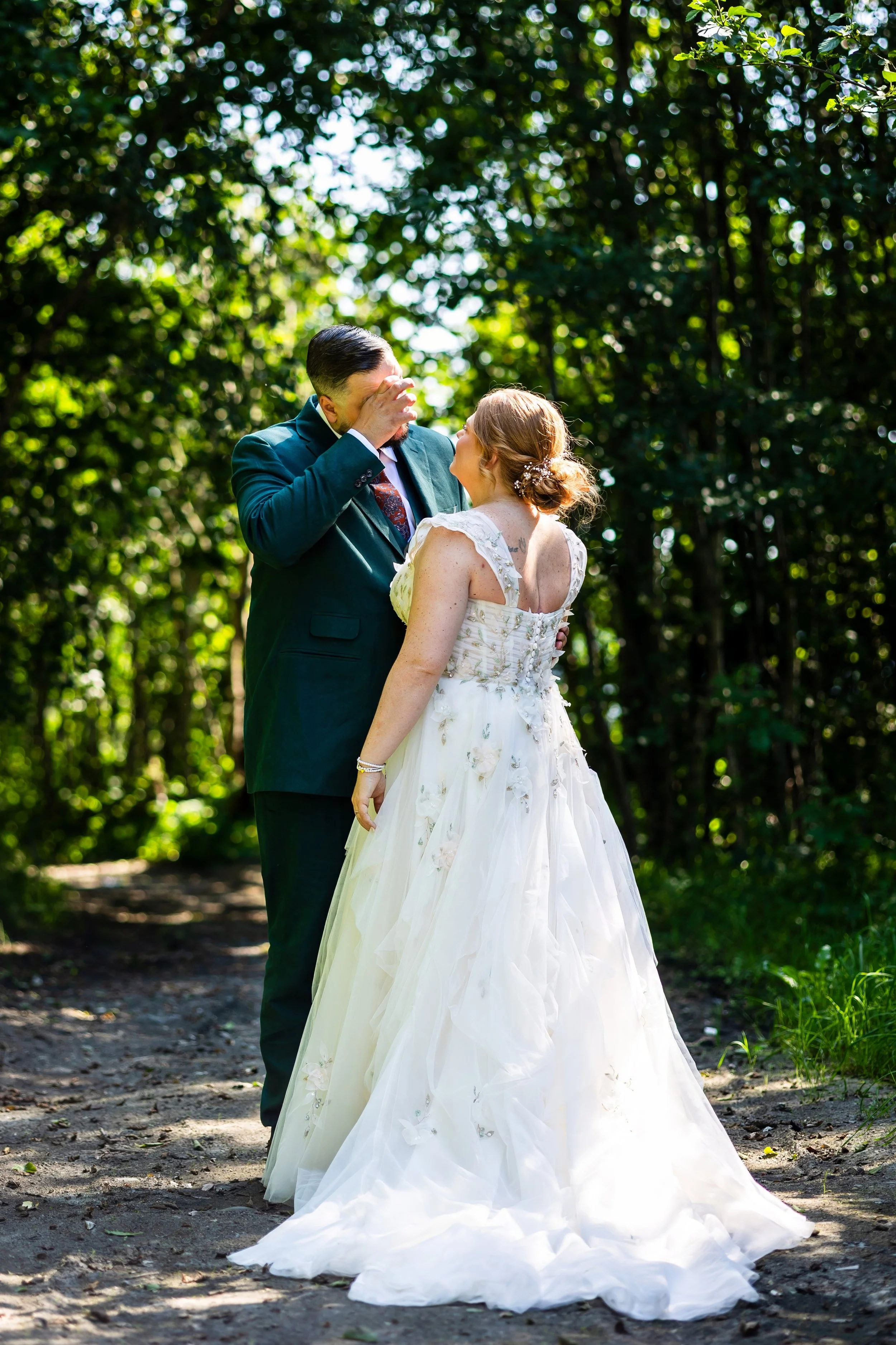Bryllupsfesten ble feiret på vakre Lerflaten gård. Før seremonien hadde de en rørende first look sammen med barna – et øyeblikk der de fikk se hverandre i bryllupsantrekket for aller første gang.